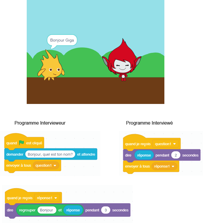 Une interview est comme une partie de ping-pong, de tennis (cf. réaliser une devinette). Les deux sprites, l’intervieweur et l’interviewé, se renvoient une balle sous la forme de questions et de réponses. Plusieurs types de blocs peuvent être utilisés pour réaliser une interview avec Scratch.